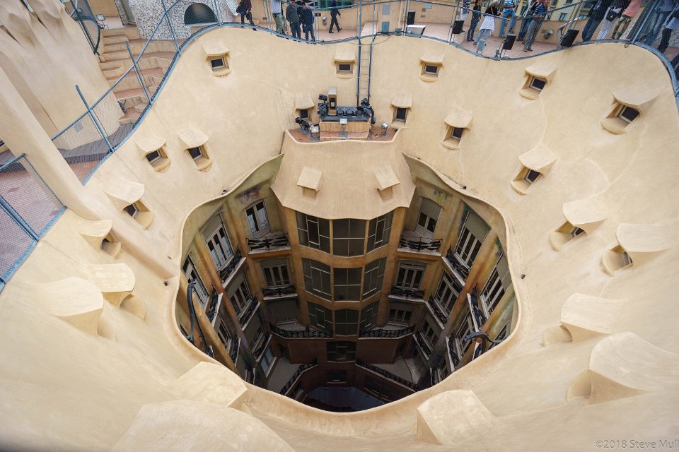 12 Barcelona - Casa Mila - Provenca Courtyard Casa Mila, popularly known as La Pedrera designed by architect Antoni Gaudí, built between 1906 and 1912. |