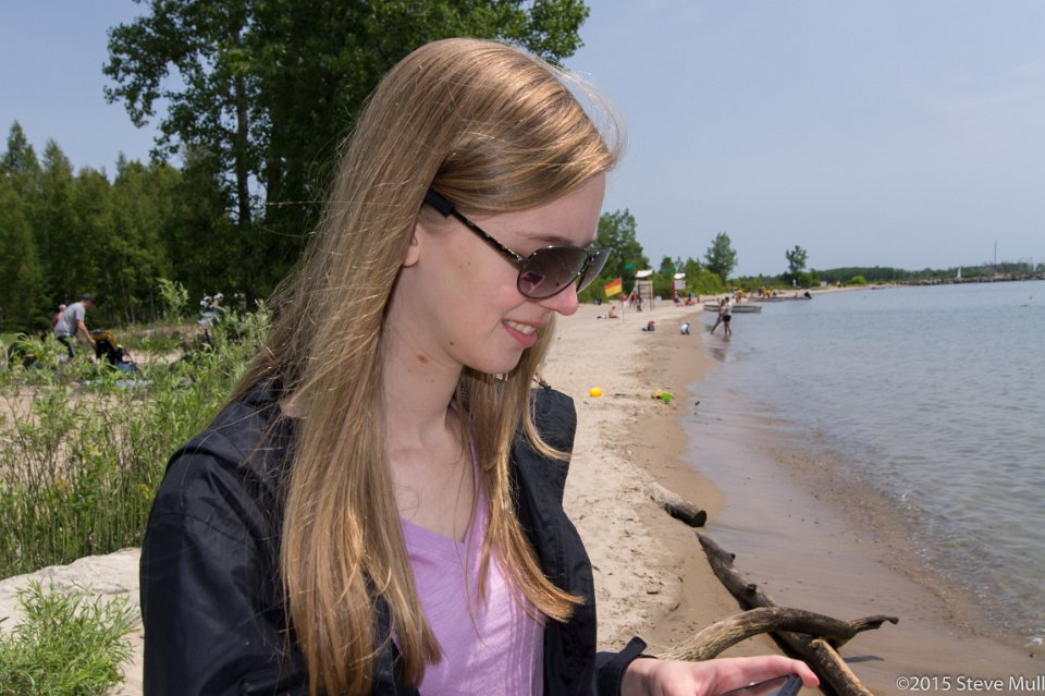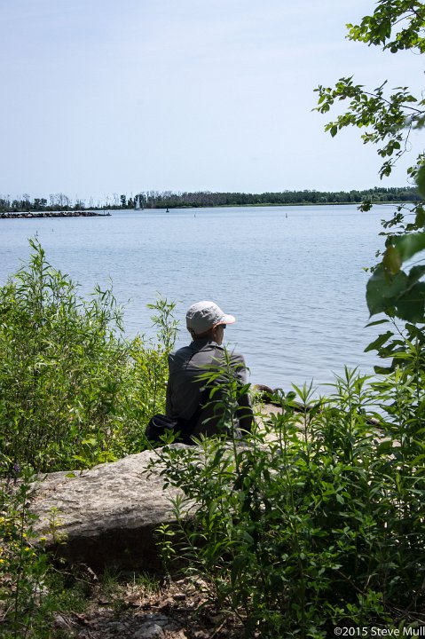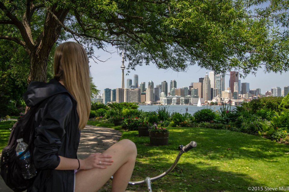 Alison gazes across the bay at the Toronto city skyline from a park on Toronto Island